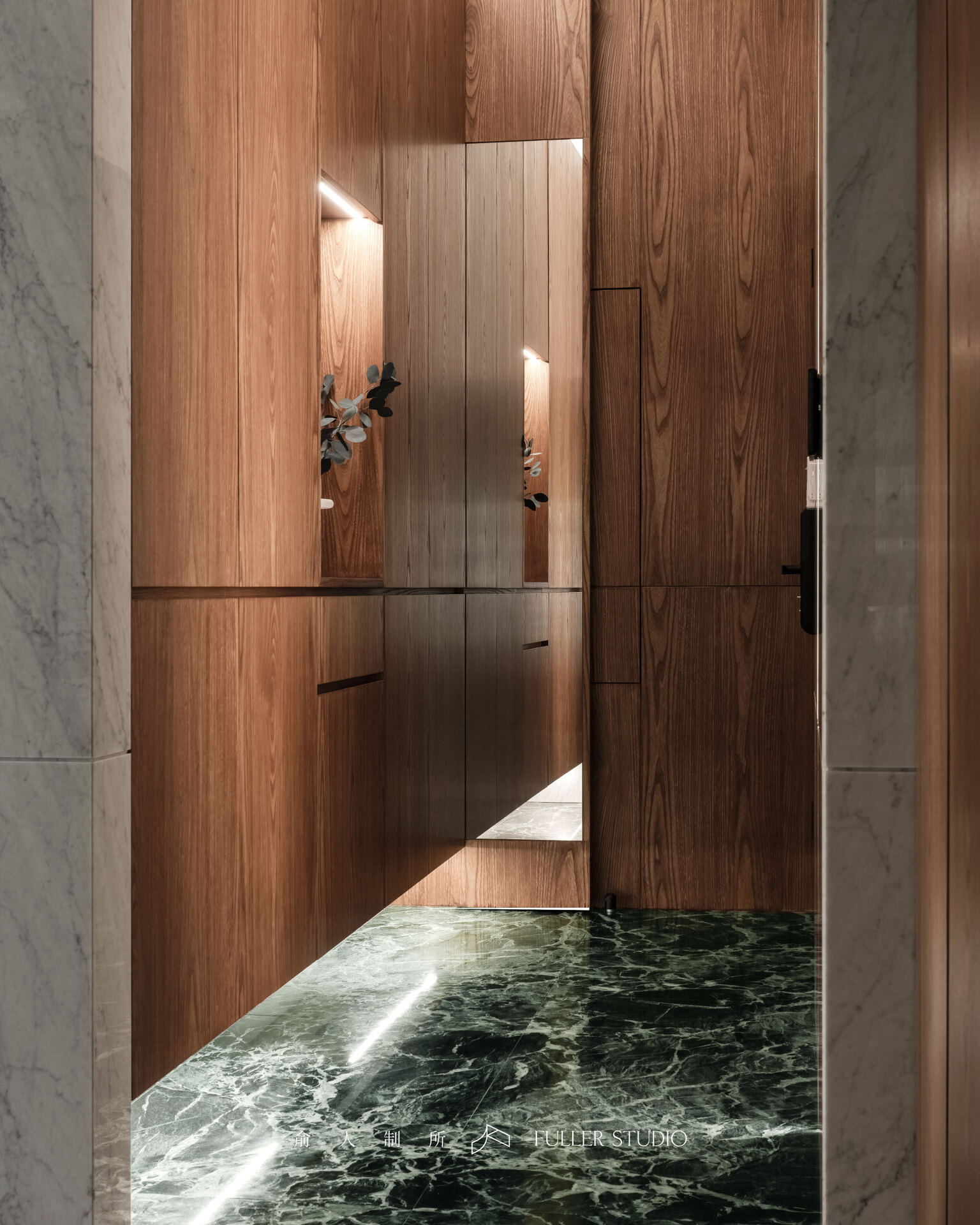 木紋被刷出立體手感,觸感更厚實。它包覆在部分牆面與結構上,讓石材的冷靜多了一份溫度。