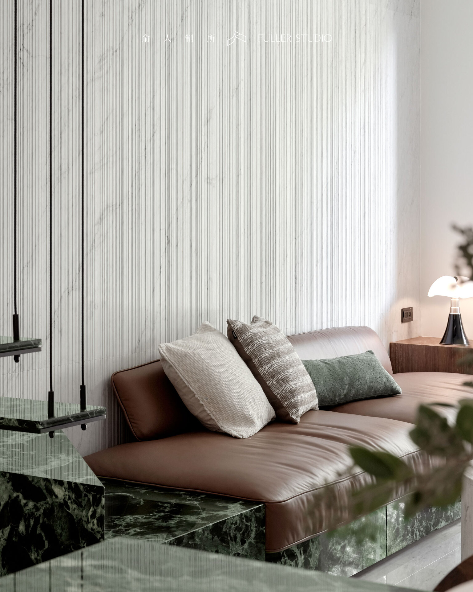 石材獨有的紋理,在光線下不斷變化。設計團隊沒有用牆去切分空間,而是讓石材的肌理自然引導動線——從客廳到餐廳,場域流動卻不混亂。