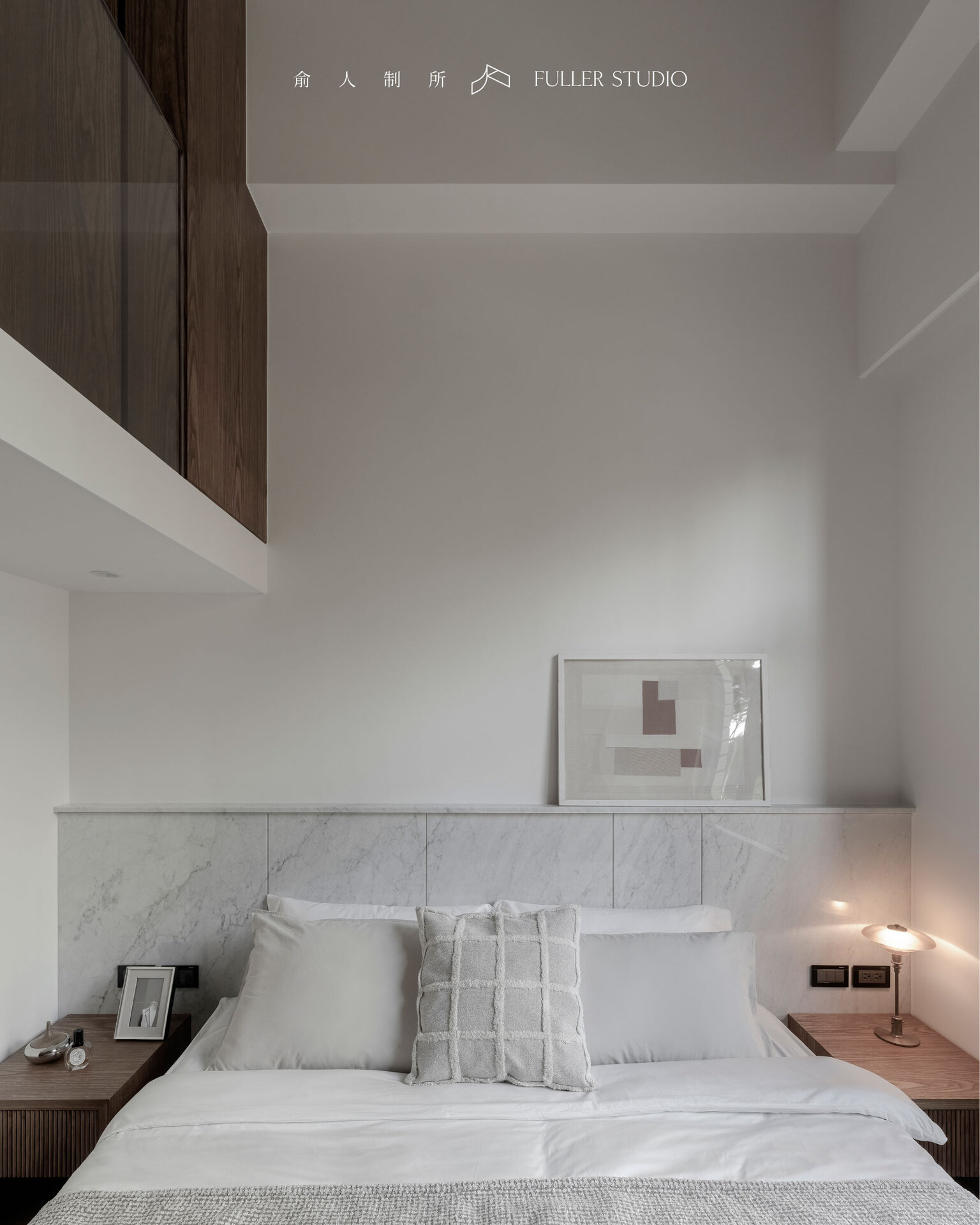 俞人制所在新北打造的住宅,以大理石為主角,展現穩定與安心感。石材紋理隨光線流動,讓空間自然串聯;春榆木的加入,則調和冷暖氛圍,增添溫潤質感。設計團隊利用挑高規劃夾層,延伸出書房或靜謐角落,並透過庭院光影引入自然呼吸。搭配地熱系統,四季皆能保持舒適。石與木的對話,讓生活在堅實與柔和間找到平衡。